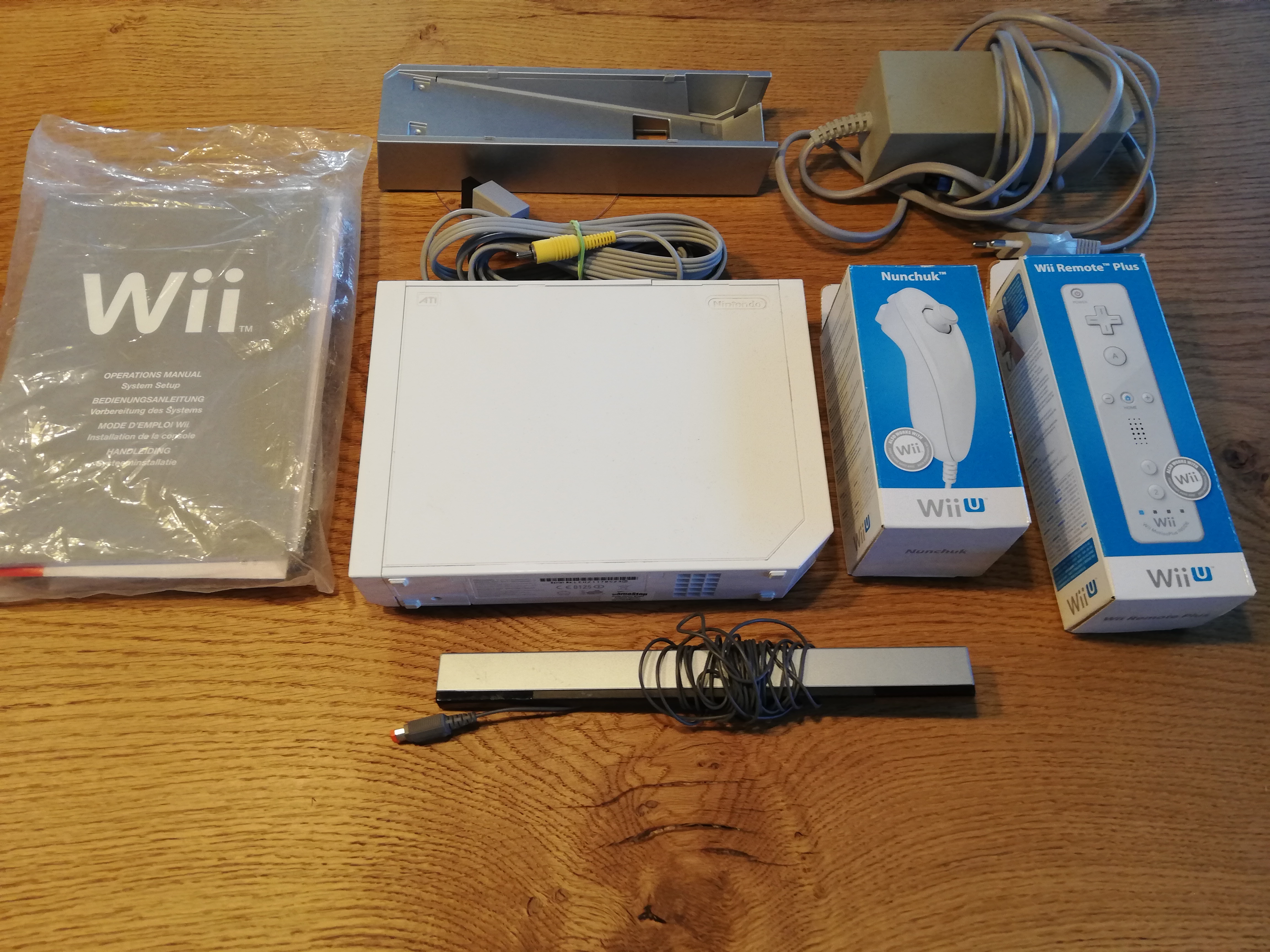 Nintendo Wii RVL 001 Weiß mit einem Wii Remote weiß Originalverpackt, ein weißen Nunchuk Originalverpackt, Sensorleiste kompletten Kabeln, Standfuß und Anleitungenn